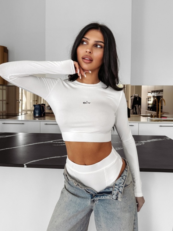 Komplet damski wykonany w 100% z wiskozy. Góra - top, o krótszym kroju z długim rękawem. Guma w pasie. Na przodzie minimalistyczny napis OLV. Dół - wysokie figi o mocno wyciętym kroju. Na tyle napis OLV.