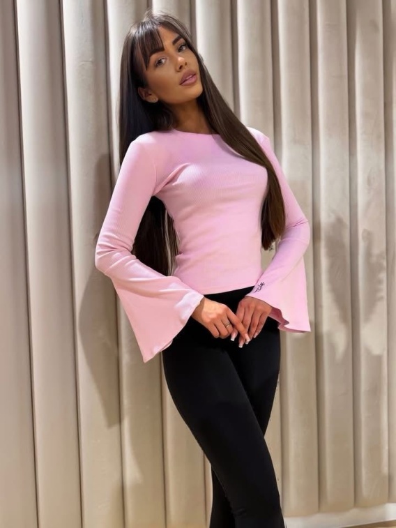 Elegancka bluzka wykonana z elastycznego materiału, model z rozszerzanymi rękawami zakończonymi falbaną.