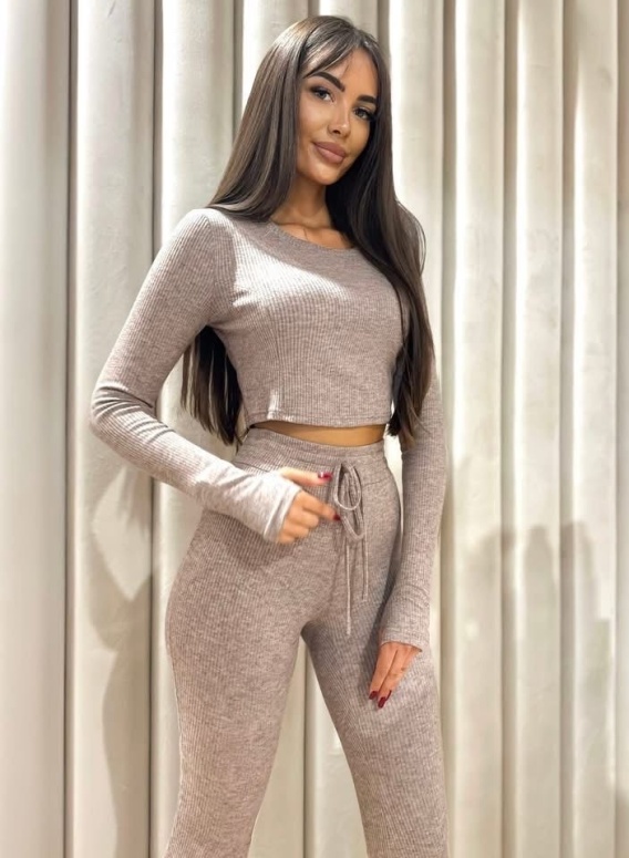 Stylowy i wygodny zestaw idealny na co dzień. Składa się z dopasowanej bluzki z długim rękawem oraz spodni z wysokim stanem i nogawkami typu dzwony, które pięknie podkreślają sylwetkę. Wykonany z elastycznego, miękkiego materiału dzianinowego, zapewnia komfort noszenia przez cały dzień oraz swobodę ruchów.