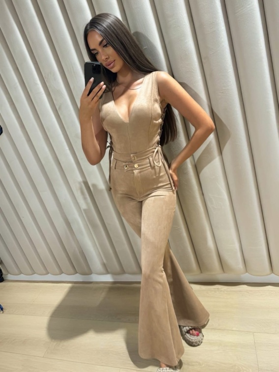 Komplet, który łączy wygodę z elegancją. Body z wiązaniami po boku, eleganckim wycięciem i spodnie z szerokimi nogawkami tworzą zestaw, który idealnie układa się na sylwetce.
